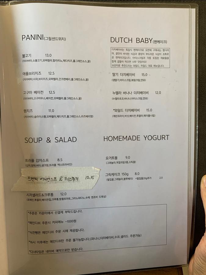 메뉴는 브런치, 파스타, 샐러드, 파니니 등 메뉴 구성이 다양했고, 음료 종류도 커피와 논커피 모두 준비되어 있어 식사와 함께 즐기기 좋은 구조였습니다.